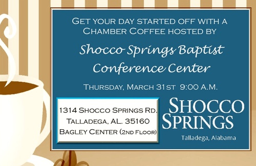 Chamber Coffee Share: Name: Chamber Coffee Date: March 31, 2016 Time: 9:00 AM - 10:00 AM CDT Registration: Register Now Event Description: Chamber Coffee hosted by Shocco Springs Baptist Conference Center To Current Calendar Location: Shocco Springs -- Bagley Center 2nd Floor 1314 Shocco Springs Rd. Talladega, AL. 35160 View a Map Set a Reminder: Enter your email address below to receive a reminder message. -- Select Days Before Event -- 1 Day 2 Days 3 Days 1 Week Captcha Validation Please complete the Captcha To Current Calendar