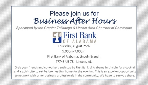 Grab your friends and co-workers and stop by First Bank of Alabama in Lincoln for a cocktail and a quick bite to eat before heading home for the evening. This is an excellent opportunity to network with other business professionals in the community. We hope to see you there.