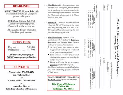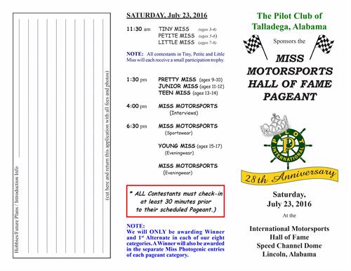 MISS MOTORSPORTS HALL OF FAME PAGEANT Share: Name: MISS MOTORSPORTS HALL OF FAME PAGEANT Date: July 23, 2016 Time: 11:30 AM - 7:00 PM CDT Event Media: To Current Calendar Location: International Motorsports Hall of Fame Speed Channel Dome Lincoln, Alabama Contact Information: Send an Email Set a Reminder: Enter your email address below to receive a reminder message. -- Select Days Before Event -- 1 Day 2 Days 3 Days 1 Week Captcha Validation Please complete the Captcha To Current Calendar