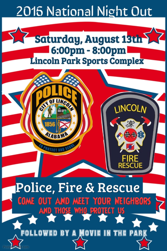 Lincoln Police, Fire and Rescue Departments will host our First Ever NNO at Lincoln Park Sports Complex, 1584 Holly Hills Road, August 13th, 6pm-10pm. The night out is free and will include, face painting, free hot dogs and drinks, helicopters, musical entertainment, a movie, LHS Varsity Cheerleaders, finger printing, bounce house, door prizes, mascots, and lots more….