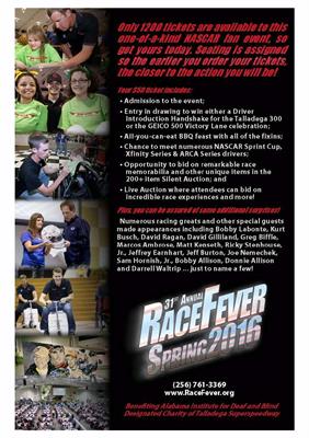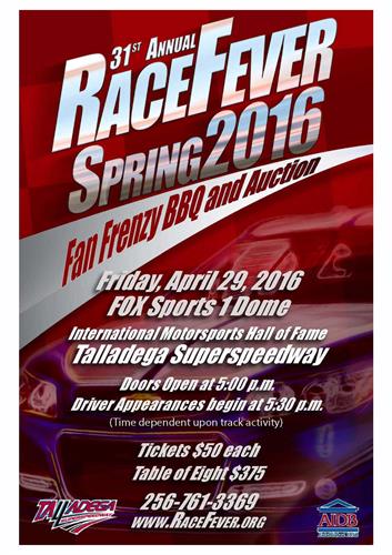 Race Fever Share: Name: Race Fever Date: April 29, 2016 Time: 5:00 PM - 9:00 PM CDT Website: http://racefever.org Event Media: To Current Calendar Location: FOX Sports Dome - International Motor Sports Hall of Fame 3198 Speedway Blvd Talladega, AL 35160 View a Map Date/Time Information: Friday, April 29th 2016 5:00 Contact Information: Send an Email Fees/Admission: Tickets $50 each Table of eight: $375 Set a Reminder: Enter your email address below to receive a reminder message. -- Select Days Before Event -- 1 Day 2 Days 3 Days 1 Week Captcha Validation Please complete the Captcha To Current Calendar